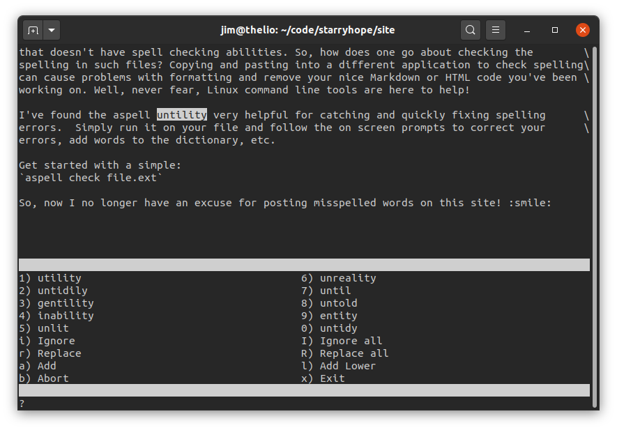 I’m a terrible speller. I often misspell words or make typos when working in a code editor that doesn’t have spell checking abilities. So, how does one go about checking the spelling in such files? Copying and pasting into a different application to check spelling can cause problems with formatting and remove your nice Markdown or HTML code you’ve been working on. Well, never fear, Linux command line tools are here to help!