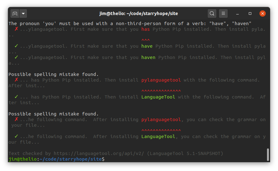 There’s an open source tool and API out there called LanguageTool that is similar to Grammarly in that it checks grammar in addition to spelling. To use this API from the command line, you can install pylanguagetool.